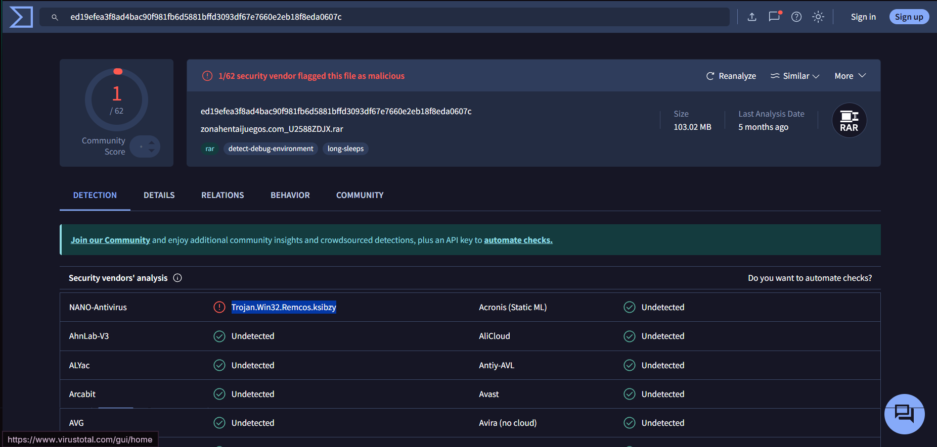 Hola, envío este mensaje para reportar los resultados de los análisis de seguridad realizados al archivo del juego. Se utilizaron tres servicios líderes en detección de malware y virus, aplicando diversas metodologías en cada uno: