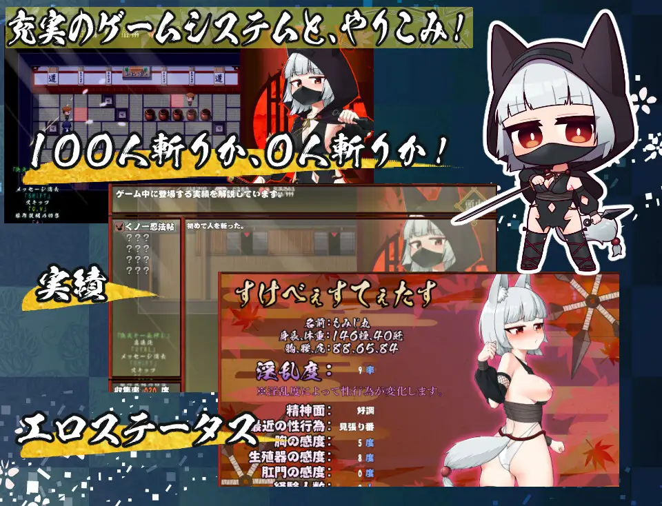 ¡Únete a Momijimaru, un ninja de élite en una misión de supervivencia en este ARPG de sigilo! Escabúllete entre los enemigos y ataca desde las sombras, ¡o enfréntate a ellos de frente con un golpe decisivo! Pero cuidado, ¡un movimiento en falso puede llevar a nuestro agente de las sombras a muchas situaciones precarias!