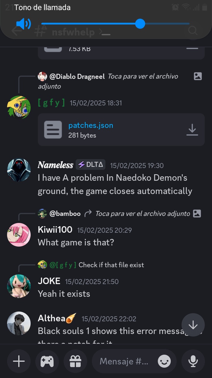 1. Después unirte al grupo de Joiplay, una vez adentro busca la sección "Patches" (así se llama) y buscas el archivo "patches.json" o toma captura de pantalla al error del juego y pide ayuda en "HelpNsfw".