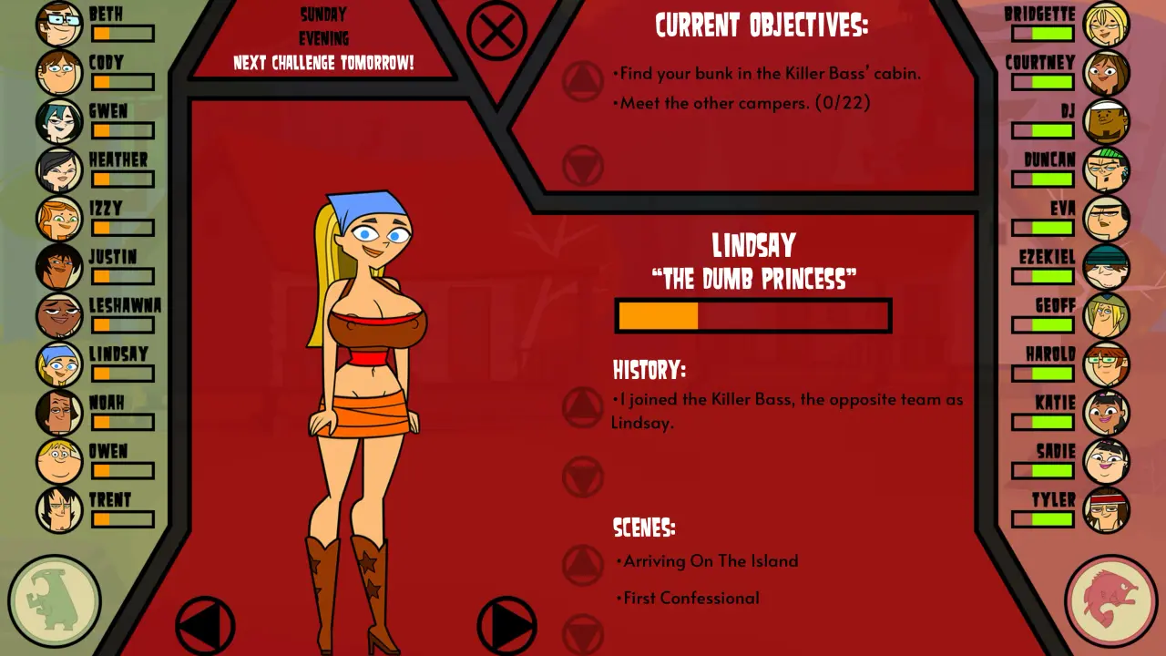 Como el último concursante en conseguir un puesto en la Isla de la Degeneración Total, esta es tu oportunidad de conseguir fama, fortuna… ¡y puede que también un pequeño botín por el camino! Interactúa con los otros campistas locos y compite en desafíos con nuevos y lascivos giros. Las decisiones que tomes en el juego determinarán tu posición entre los demás concursantes, ¡así que asegúrate de mantener tus relaciones y quedar bien con todos! Después de todo, ¡no querrás que te expulsen de la isla! Cada actualización añade nuevas historias y misiones, minijuegos, pinups y escenas animadas.